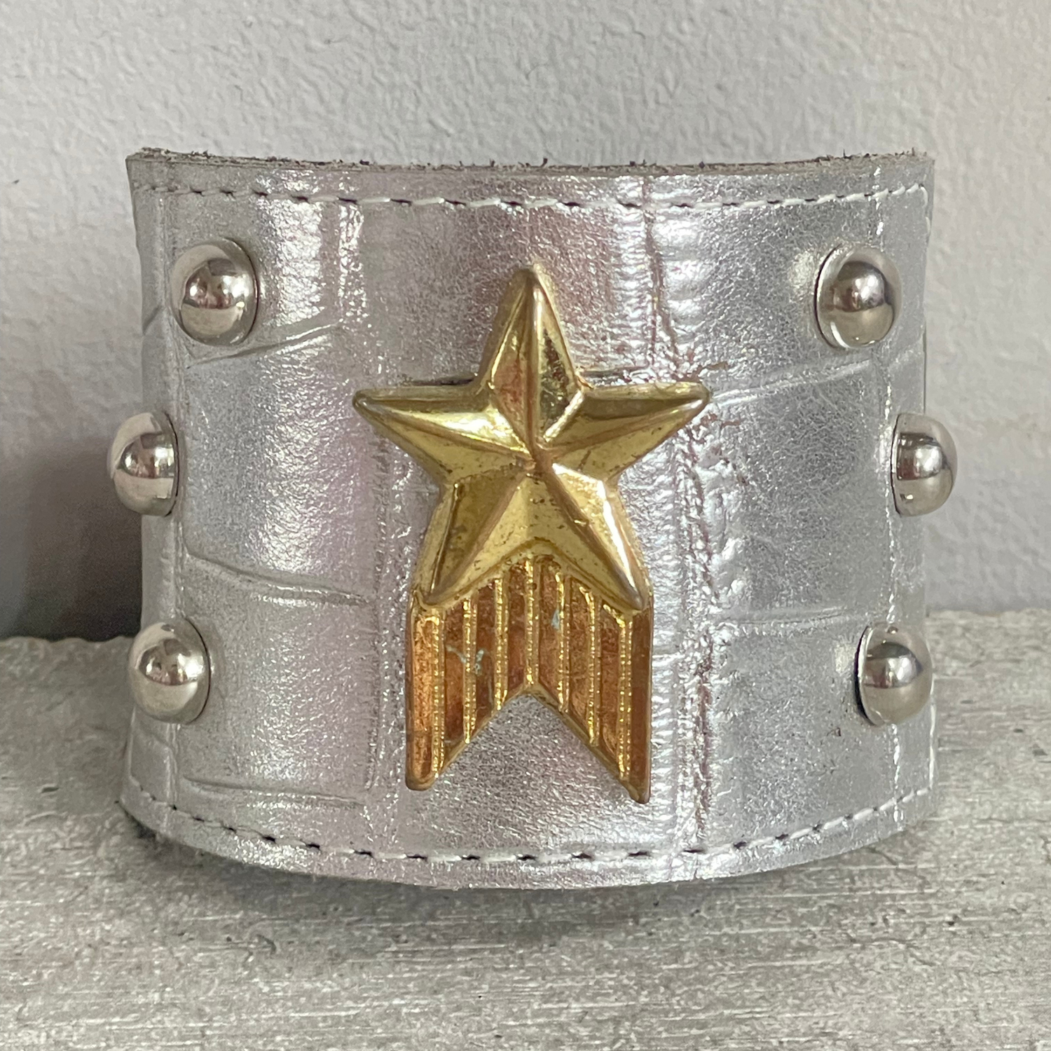 Pulsera hecha a mano con cuero croco 100% genuino, aplicaciones metálicas en variadas formas dependiendo del modelo y grosor. Un accesorio que combina estilo, color y exclusividad en cada detalle. Disponible en distintos colores y metalizados con hebillas ajustables para un calce perfecto a tu muñeca.